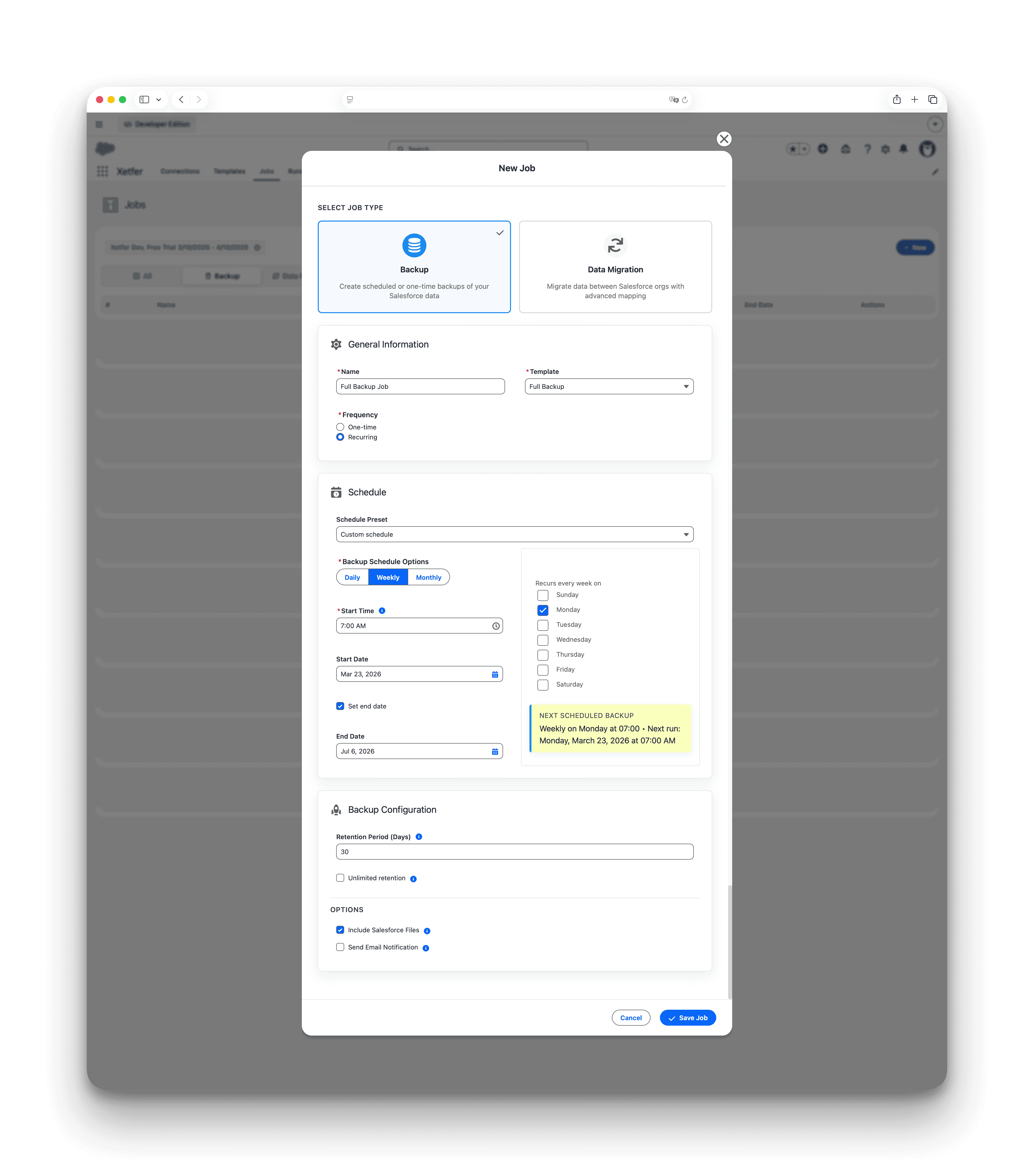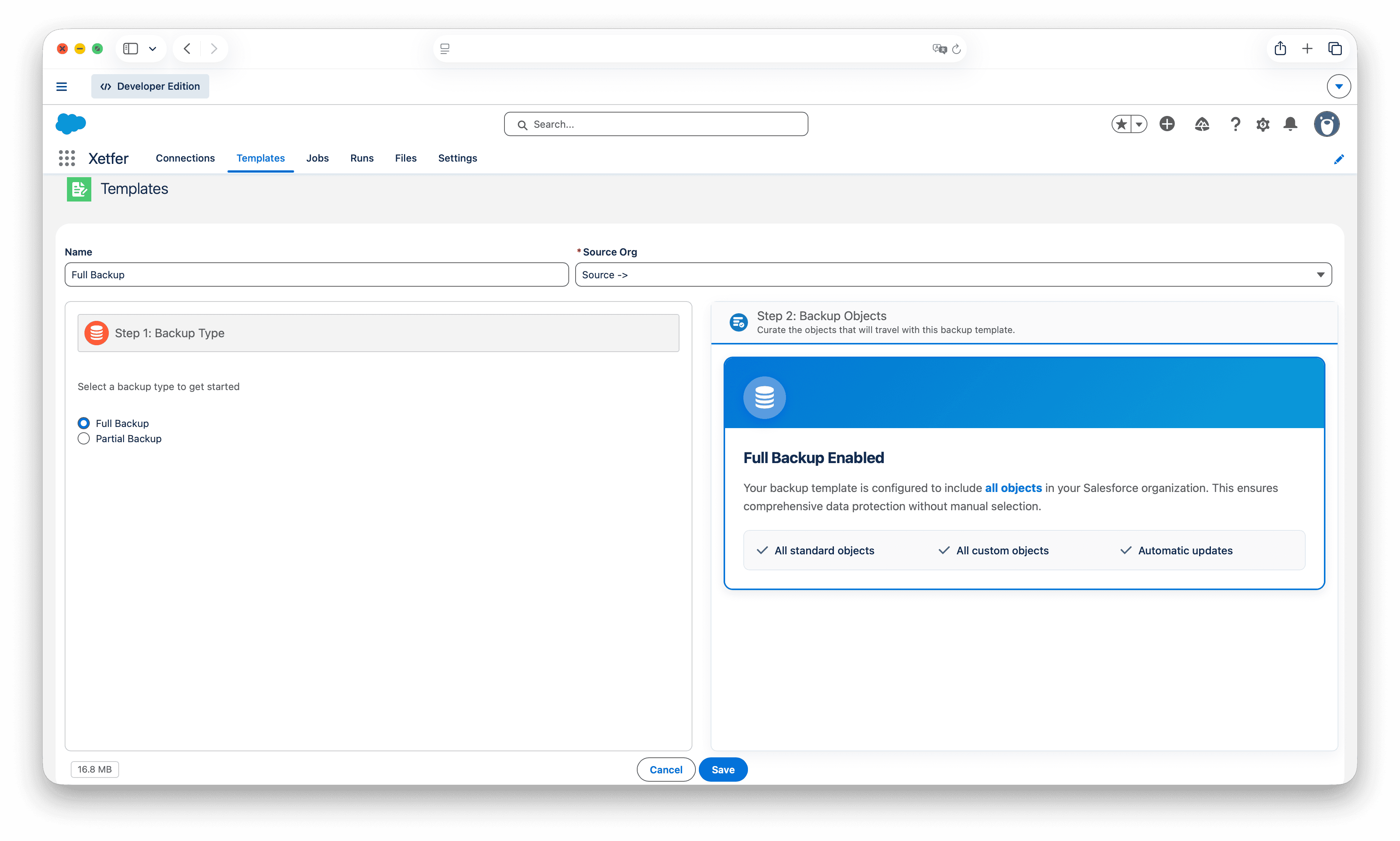 - Full or Partial Backups: The ability to choose between Full and Partial backup types within their templates. Select a “Full” backup for full-org snapshots, or select “Partial” to curate specific objects for targeted data backup.